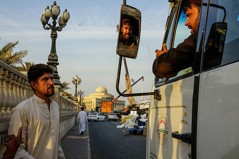 Lunch comes around noon inside a shaded resting area. Workers open plastic containers of rice, curry, or flatbread brought from labor camp kitchens. Some sit facing the sea. Many scroll quietly through their mobile phones, checking messages from families in South Asia or other distant regions.